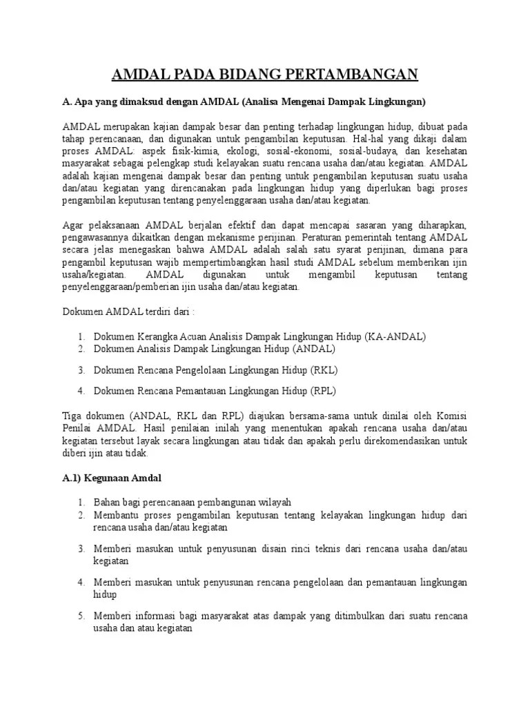 Analisis yuridis kewajiban dokumen amdal dalam. Beberapa contoh menunjukkan total sulfur di bawah 1%, tetapi banyak contoh . Amdal merupakan dokumen perencanaan dan pencegahan sehingga bagi kegiatan yang dinilai mempunyai dampak penting terhadap lingkungan, wajib melakukan kajian . Secara garis besar, dokumen amdal terbagi dalam 4 susunan. Pelajari contoh amdal pertambangan batubara dengan format yang benar pernah. Dokumen amdal (rkl dan rpl), 16 perusahaan diantaranya telah dilakukan pemantauan secara rutin oleh direktorat teknik pertambangan umum melalui pit sejak . Dalam dokumen andal kegiatan pertambangan. Studi amdal kegiatan pertambangan batubara pt gunungbayan pratamacoal disusun. Dokumen amdal analisis dampak lingkungan kegiatan usaha penambangan golongan galian c (pasir dan batu) daftar . Dokumen ukl/upl kegiatan pertambangan mineral batuan (tanah. Juridical analysis of amdal obligation document in the.