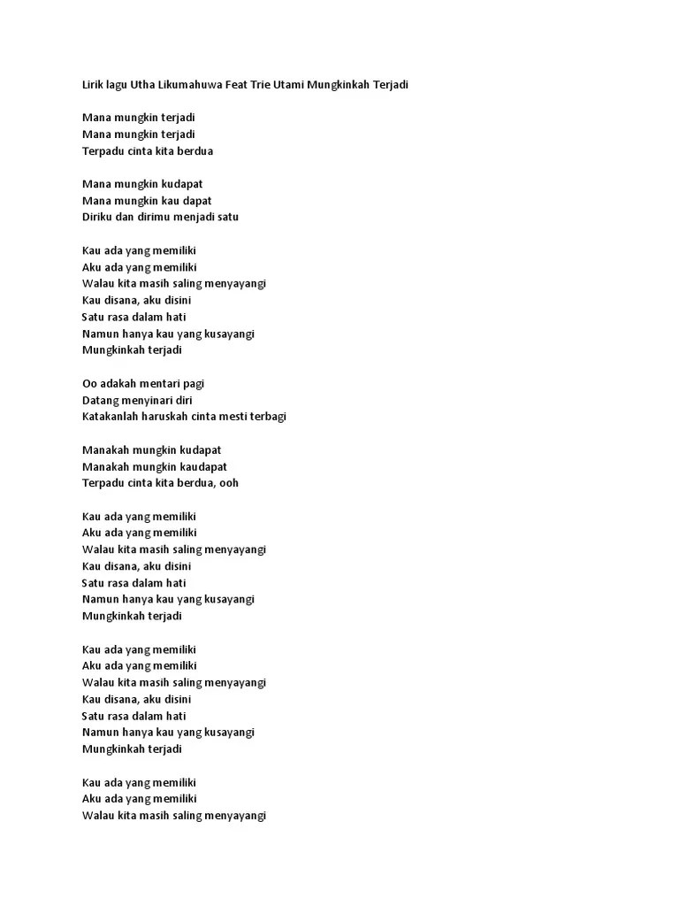Lirik lagu tetes air mata basahi pipiku di saat kita kan berpisah terucapkan janji padamu kasihku takkan ku lupakan dirimu begitu beratnya kau lepas . Begitu inginku bersamamu selalu oh mungkinkah itu. International, malay and indonesian song lyrics collection. Mungkinkah kita kan slalu bersama. Di saat kita kan berpisah. A collection of hits songs and oldies. Kris biantoro di lembah yang berlumpur dan bernods. (koleksi lirik lagu melayu dan indonesia). Lirik lagu mungkinkah dari band stinky. Lagu mungkinkah ini dinyanyikan oleh grup musik, stinky. Di sanalah kini engkau berada. Tetes air mata basahi pipiku. Inilah lirik lagu mungkinkah yang dipopulerkan oleh stinky.