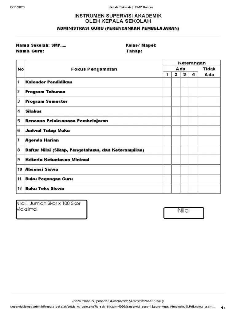 1 instrumen supervisi administrasi pembelajaran nama sekolah :.